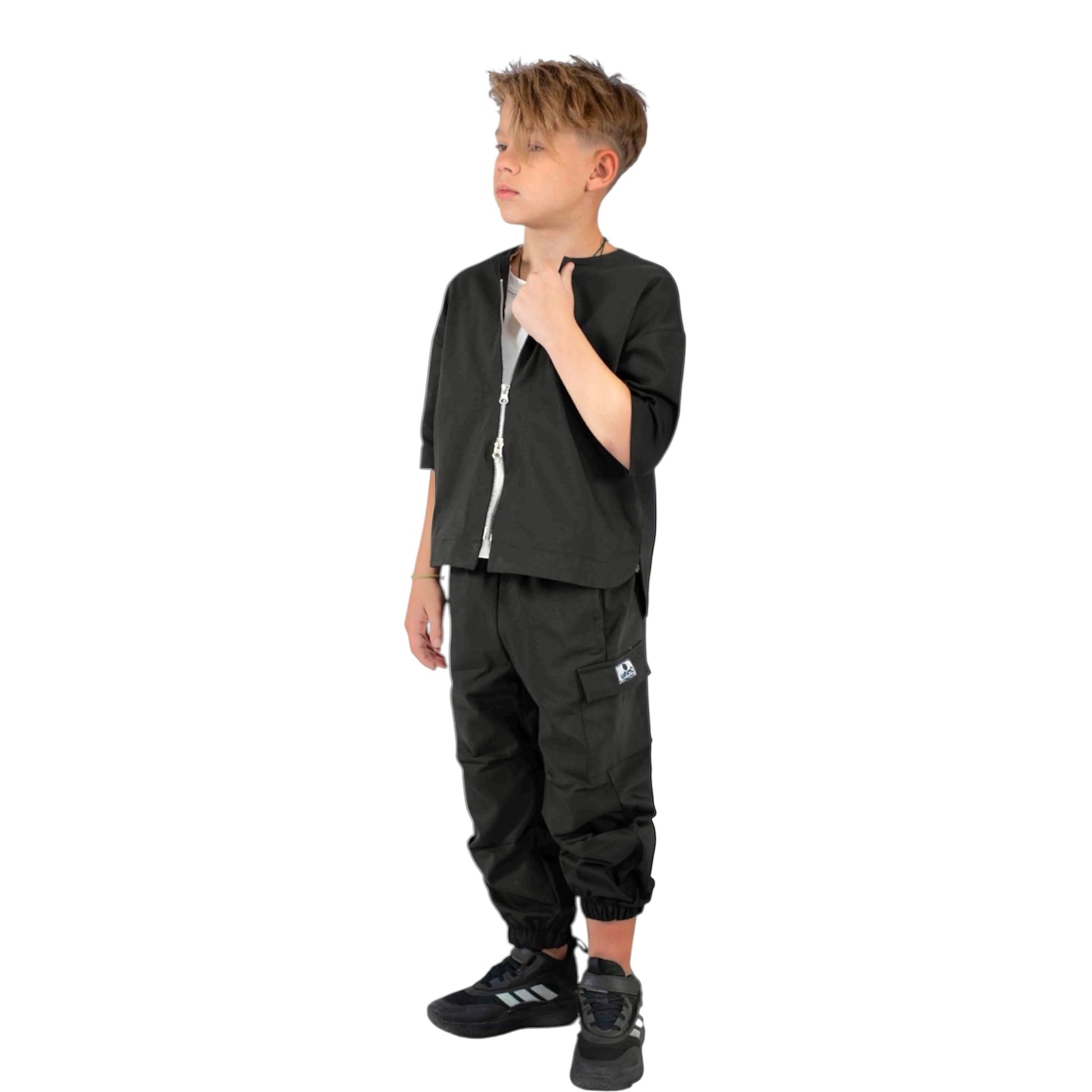 Παιδικό σετ με κοντομάνικο zip top και cargo παντελόνι με λάστιχο στο τελείωμα. Μοντέρνος σχεδιασμός με πρακτικές τσέπες και άνετη εφαρμογή που προσφέρει ελευθερία κινήσεων. Ιδανική επιλογή για δυναμικές και stylish εμφανίσεις.
